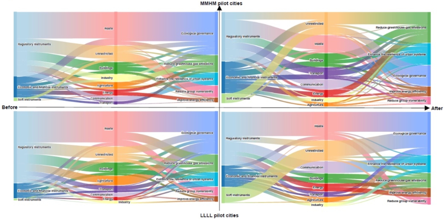此外,基于“政策工具—政策路径—政策目标”框架对MMHM与LLLL两类双试点城市的分析表明(图2),双试点政策实施后,两类城市均呈现出政策工具多元化的发展趋势,从以往依赖监管类工具逐步转向监管、经济与软性工具的均衡使用。MMHM城市更侧重经济和金融类工具,借助市场化机制推动低碳项目并吸引私人资本,提升政策效率;LLLL城市则偏重软性工具,通过宣传教育增强公众意识,促进社会共识与行为改变。在政策路径上,MMHM城市重点推进交通与通信领域建设,包括公共交通、智能交通系统及通信基础设施,以提高交通效率与气候适应能力;LLLL城市则集中于工业与能源领域,推动能效提升与清洁能源生产,在减少排放的同时加强能源安全。就政策目标而言,MMHM城市更注重减缓与适应并重,如发展低碳交通、优化城市规划与强化生态服务;LLLL城市则以环境保护为核心,同时对韧性建设与减缓目标的重视程度也逐步上升。总体来看,双试点政策明显影响了两类城市的政策取向与实施重点。MMHM城市在减缓和适应方面成效显著,而LLLL城市尽管基础较弱,但在政策激励下也展现出良好的发展潜力。
