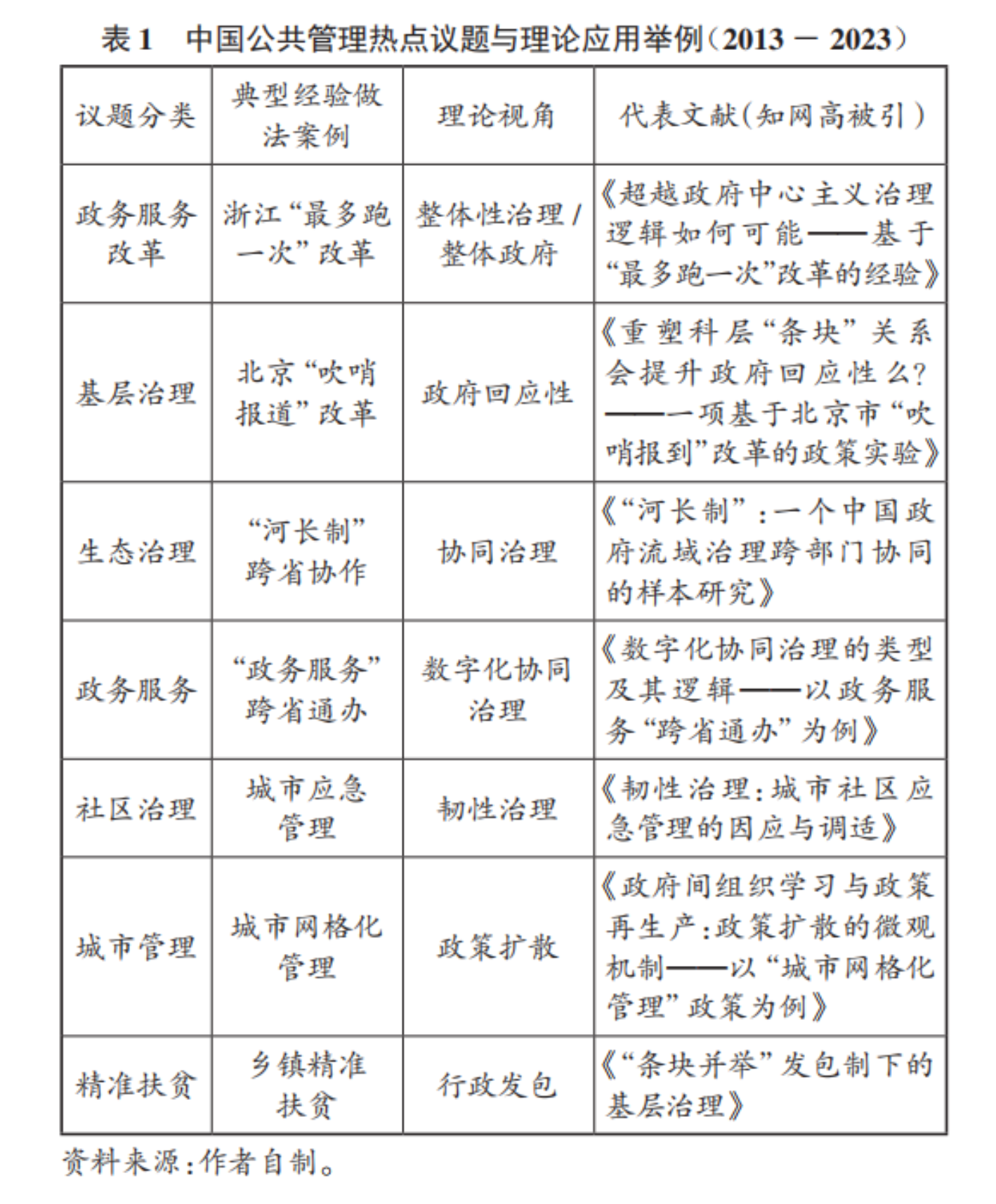 其二,在议题选择层面,表现为从填补理论空白逐步转向聚焦“中国故事”的问题自觉。改革开放至党的十八大前夕,中国公共管理学科发展呈现出鲜明的“理论引进-问题应对”特征。这一阶段的中国公共管理学术研究始终为中国行政体制与公共服务改革提供理论与实践支持。国际公共管理的理论引进填补了中国公共管理研究的大量空白,也为相关的改革举措提供了切实的智力支持但也导致了一定程度的学术话语依附性情景。党的十八大以来,中国公共管理实践在新时代变革的驱动下进入创新活跃期,在政务服务改革、基层治理创新、数字政府建设等领域形成了独具特色的本土化治理模式。在治理实践蓬勃发展背景下,中国公共管理学的议题选择也从“填补空白”向“自主选择”转变,学者们尝试主动选择公共管理的“中国故事”,用前沿理论解释中国实践(见表1)。如何围绕“中国故事”进行更加自觉且深入的提问,注定是新时代中国公共管理学者的重要学术使命。