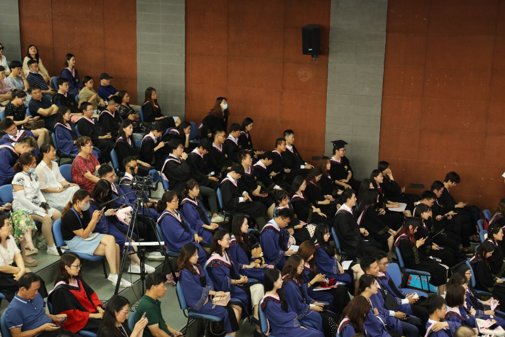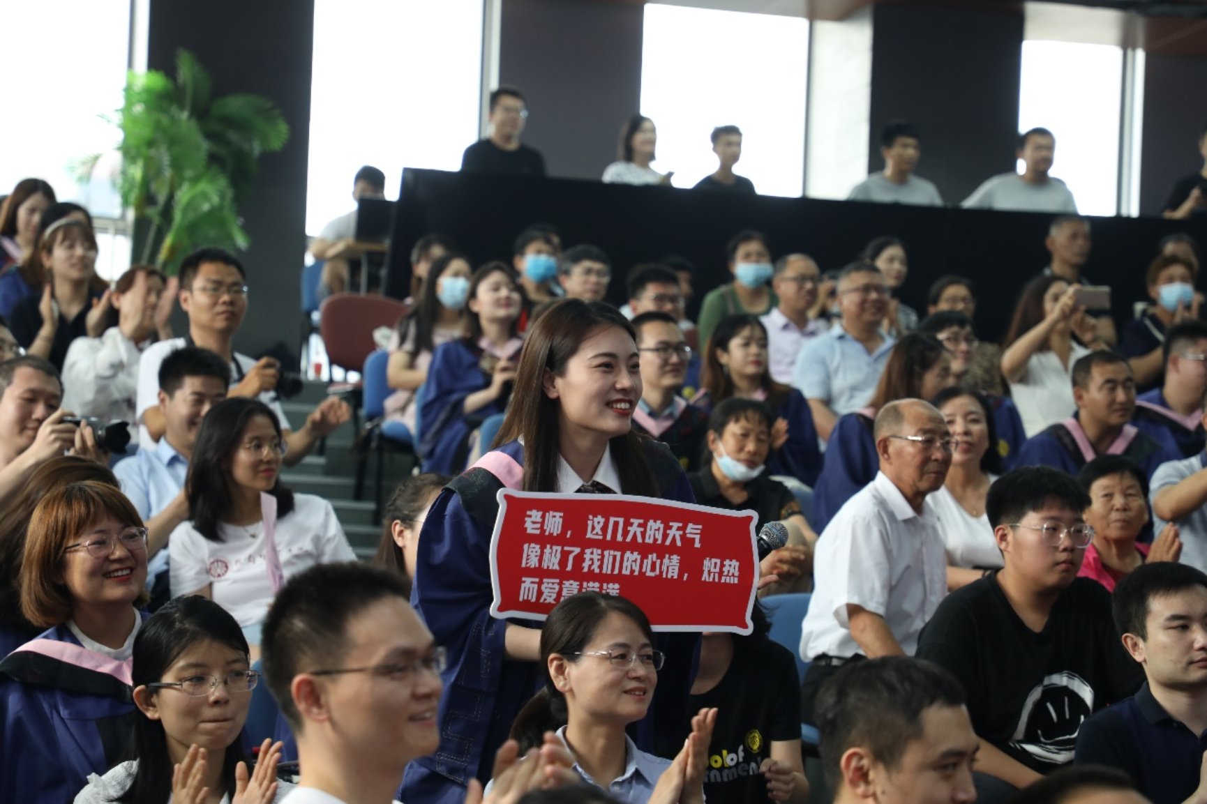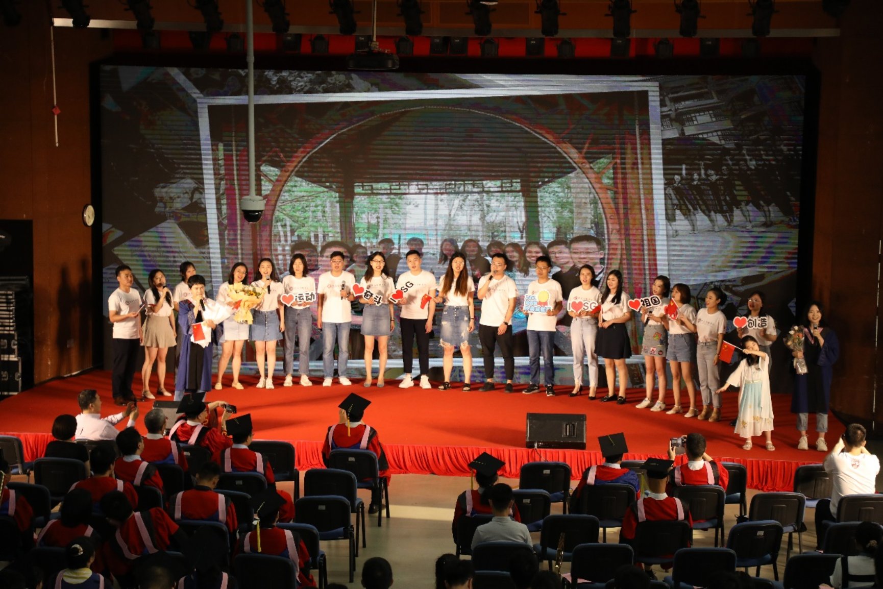 在感恩环节,师生共同观看了教师和家长寄语视频,主持人从现场抽取了同学们的感言,得到了场内外的热烈响应。在《燕园情》的歌声中,毕业生们为身边的同伴佩戴校徽,表达对同伴的感激与祝福。