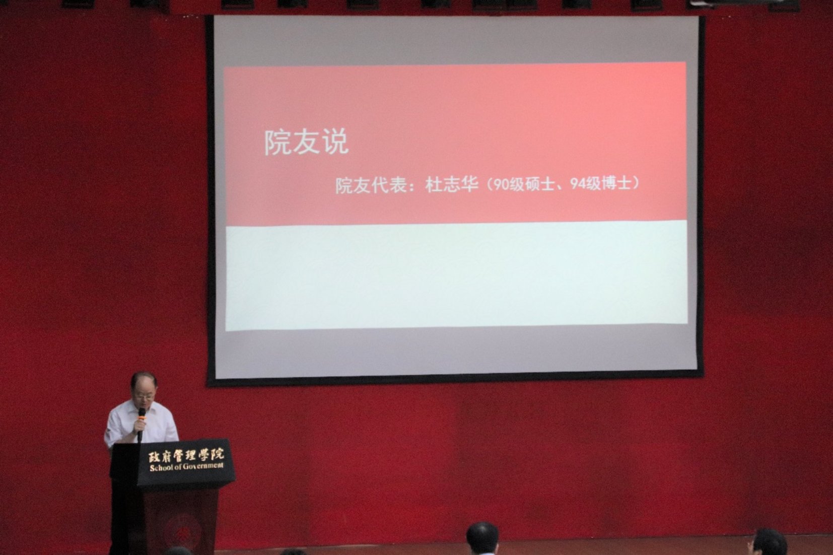 1990级硕士、1994级博士杜志华代表本年度值年院友,从知识、知道、技能三个方面入手,向同学们阐述了自己在北京大学读书的收获与感悟,分享了自己对于政治学研究的认识;同时,他结合多年的工作学习经历,建议同学们在大学期间要树立更高的自我价值,坚持底线和原则,激励同学们通过实践的锻炼掌握将理论应用于实践的技能。