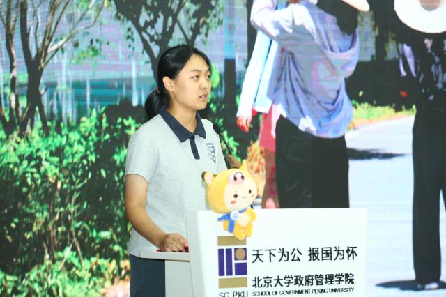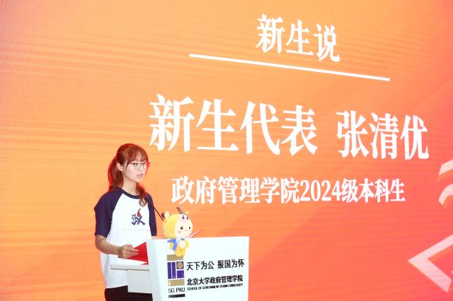 在欢快有趣的开场视频之后,开学典礼拉开帷幕。2024级本科生张清优作为新生代表发言,她分享了自己初入燕园的感受,表达了作为政管新人,关注公共领域、传扬政治文明的坚定决心,希望与同学们一道在北大这片土地上自由探索,沉潜学术品格、厚植家国情怀、勇担时代使命。