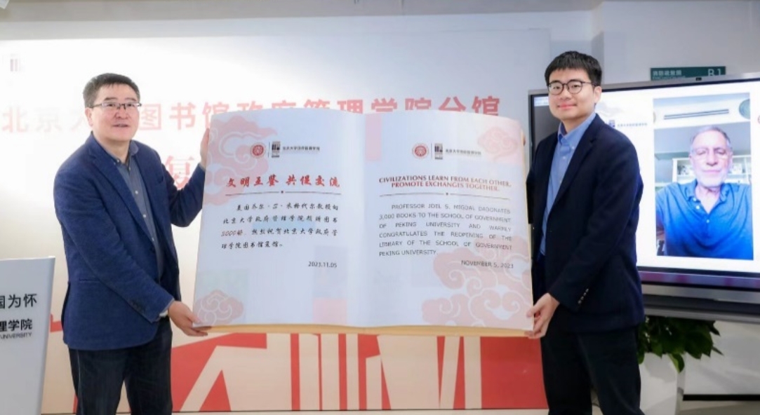 华盛顿大学国际关系学院荣休教授乔尔·S·米格代尔教授向学院图书馆捐赠3000余册英文图书。仪式现场播放其精心录制的视频。学院助理教授马啸代表米格代尔教授发言,希望同学们利用这些藏书多读书、读好书,助力自己的科学研究,祝愿学院图书馆不断丰富馆藏,为推动教学科研和国际交流做出更大贡献。