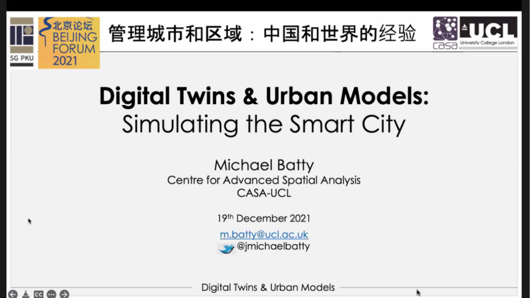 伦敦大学学院高级空间分析中心MichaelBatty教授以“数字孪生与城市模型:模拟智慧城市”为题进行了报告,他首先列举了大量的案例来阐述数字孪生的内涵,然后介绍了数字孪生的四个具体研究案例,最后探讨了数字孪生的意义。MichaelBatty教授认为,一方面我们有很多的模型可以帮助思考城市问题,也需要考虑如何把信息技术更好地嵌入到整个社会的城市发展系统中,此外使用不同的数据模型进行比较与参照也非常重要。