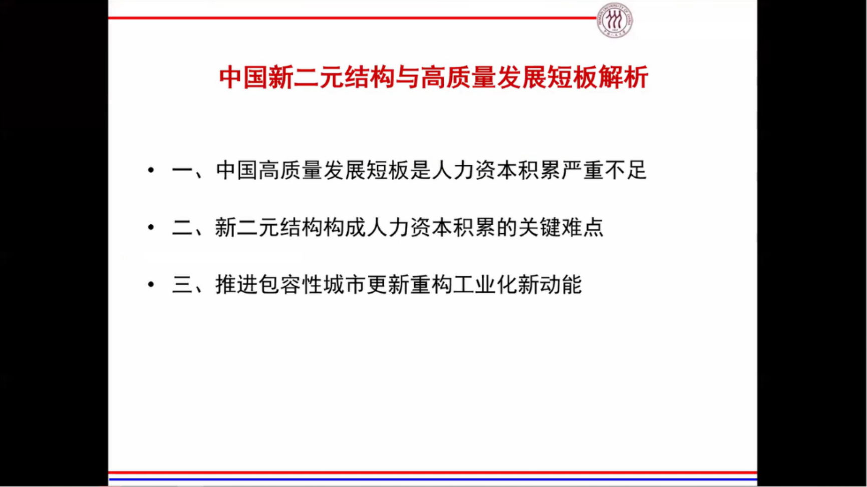 中国人民大学公共管理学院叶裕民教授以“中国新二元结构与高质量发展短版解析”为题,指出中国高质量发展短板是人力资本积累严重不足,而新二元结构是人力资本积累的关键难点,建议通过推进包容性城市更新重构工业化新动能。叶裕民教授认为,高质量发展不仅是狭义的经济体系改革,它根植于社会,根植于人的发展,根植于对广大人民美好生活追求的满足以及其创造力的发挥,中国高质量发展的本质是经济高质量发展、人民高品质生活和社会高水平治理的联动优化,而不仅仅是经济本身。叶裕民教授提出包容性城中村更新可成为破解新二元结构的有效途径,让全体人民生活更美好,进而为中国高质量发展创造永续动能。