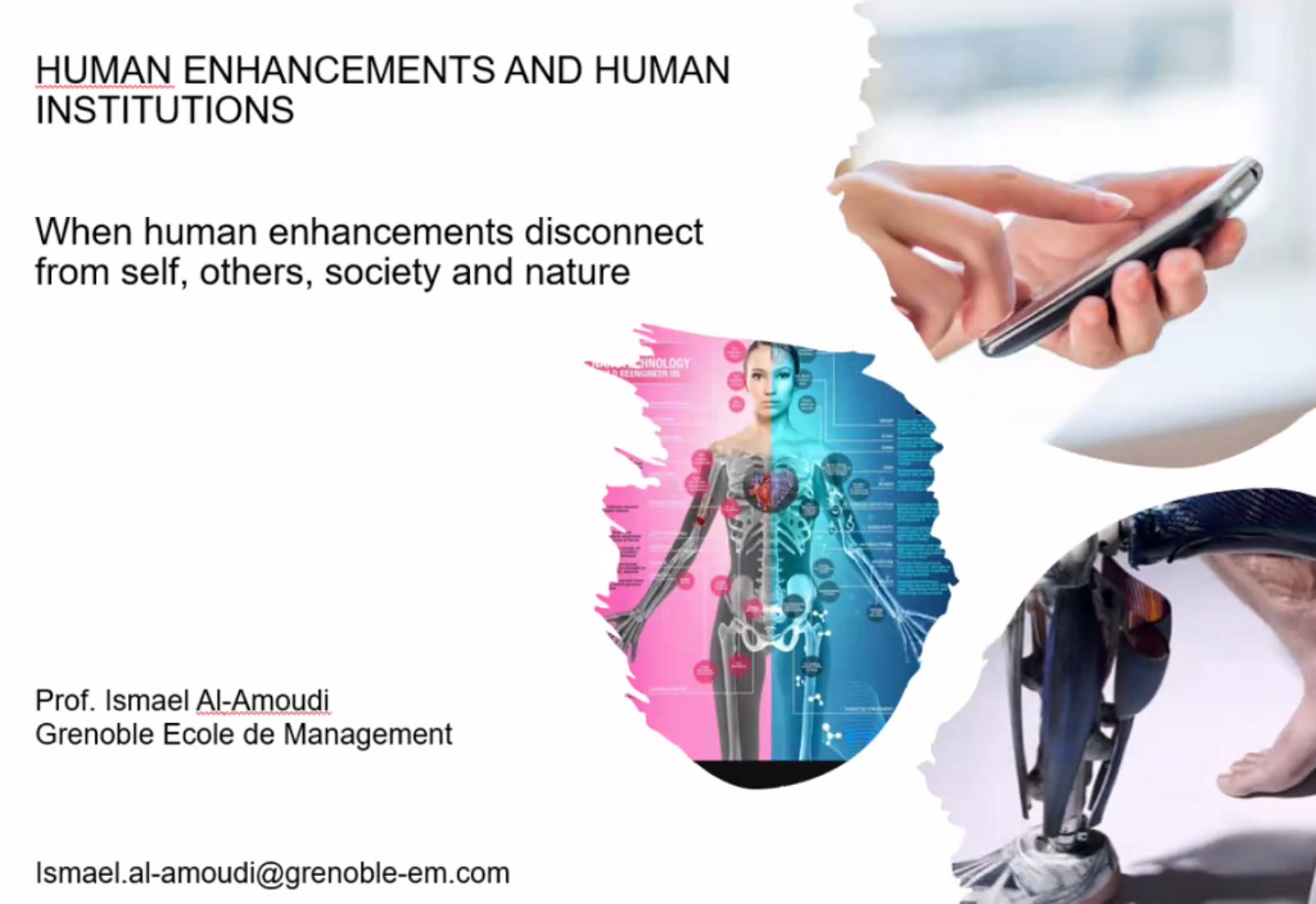 法国格勒诺布尔高等商学院教授Ismael Al-amoudi探讨的核心是人类的强化(human enhancements)和人类制度之间的关系,其关键论点是人类的强化(例如人工智能或人体假肢等)深受人类制度和大环境的影响,并在可预见的未来会引发道德问题。