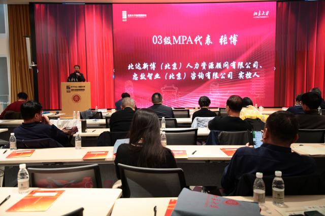 02级MPA代表洪波发言。洪波院友首先对学院、老师表示了衷心的感谢。接着,洪波回顾了往届MPA 的事迹,表示在座的同学们要“聚是一团火,散是满天星”,希望在座的各位院友继续在自己的领域发光发热。03级MPA班代表张博也分享了自己的感悟。他表示,过去20年的时光转瞬即逝,时光让每一位同学成长、成熟。20年不是终点,而是新的起点,在未来的时光里,在座的院友们仍需努力奋斗,打破年龄限制,创造新的辉煌;打破班级边界,与院友共同互帮互助。