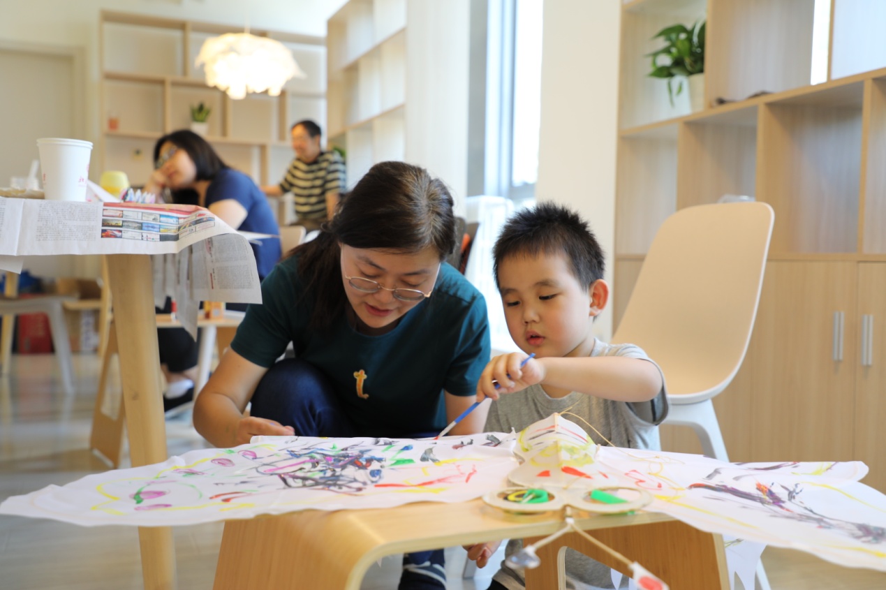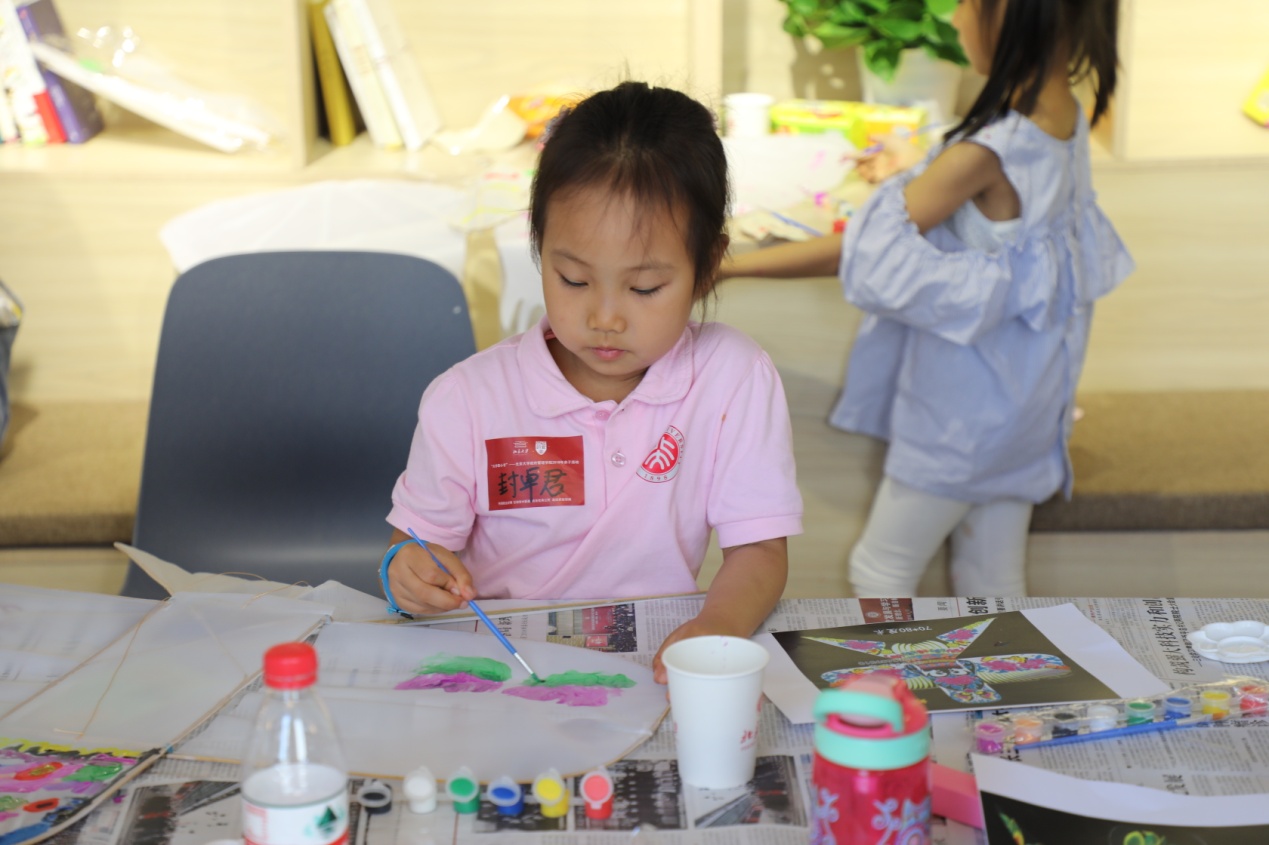 本届亲子活动的“亲子手工课”,以风筝制作为主,共有沙燕、金鱼、蝴蝶三种风筝供孩子们选择。家长和孩子们在选择风筝后,一起动手组装起来,孩子们运用丰富的想象力,耐心地用画笔为风筝穿上花衣。欢声笑语的交谈,色彩斑斓的笑容,装点了温馨的房间。随着时间的流逝,一只只小风筝也变得活灵活现,孩子们开心地和自己的作品合影。